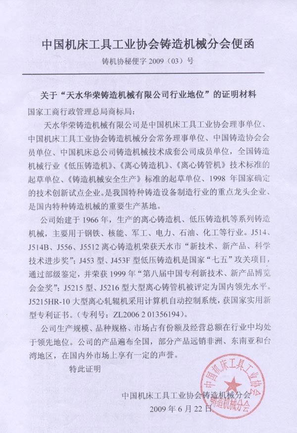 中國(guó)機(jī)床工具工業(yè)協(xié)會(huì)鑄造機(jī)械分會(huì)推薦函